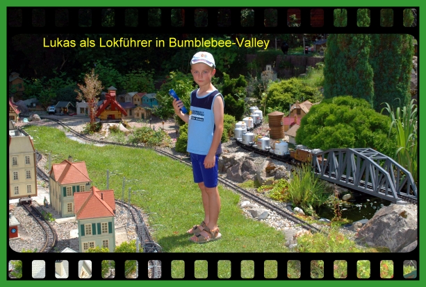 Lukas als Lokführer auf der Anlage in Bumblebee-Valley am Sonntag, 15.7.2007.